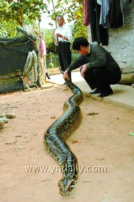 有時(shí)候夜間天冷時(shí),蟒蛇還會(huì)爬出房間,將楊建松臥室的門弄開,爬上床來與楊建松同床共枕,碰到楊建松睡覺翻身壓到身上時(shí),這條蟒蛇還會(huì)“自覺”地挪挪身子給他騰地方。這樣的狀況一直持續(xù)到楊建松結(jié)婚,將其安置在后院特制的鐵柜中才告結(jié)束。