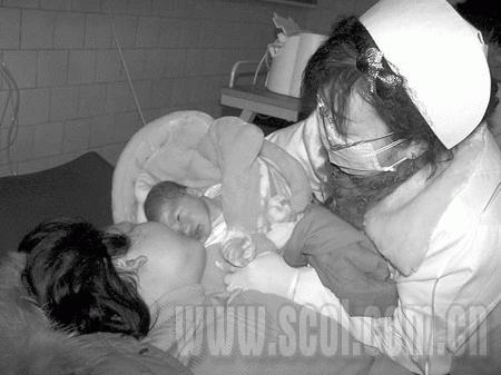 婦產(chǎn)科內(nèi),走廊上擺滿了蜂窩煤灶,上面烘烤的全是嬰兒的尿布。待產(chǎn)室門外,一個花甲老婦和一名中年男子,正焦慮不安地徘徊,不時通過門縫往里看。原來,花甲老婦名叫朱惠富,是產(chǎn)婦張大先的母親。中年男子胡成,是張的丈夫!靶液冕t(yī)院有臺大功率的發(fā)電機喲,要不然我媳婦和娃娃可慘了!焙烧f,“我媳婦進去都1個小時了,還沒消息,急死人了!薄澳阆胍獋兒子還是女兒?”“兒女都一樣,只求母子平安。我把名字都給他們?nèi)『昧,如果生的是兒子,就叫胡斌。女兒,就叫胡蝶!?/p>