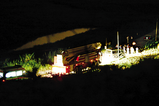 記者接報趕赴時,發(fā)現(xiàn)警方在距現(xiàn)場一公里處便已開始設(shè)卡封鎖,禁止無關(guān)人員進入(見上圖,陳文筆、張雄高攝)。209倉庫內(nèi)警燈閃爍,大批消防車出動。由于是化學(xué)品失火,不能用水撲救,因此不斷有泥頭車從外面運來干沙滅火。昨晚11時許還增加了一輛挖掘機進場。待情況穩(wěn)定后,不斷有此前從倉庫疏散出來的工人經(jīng)同意后重新進入庫區(qū)。