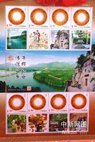 牛郎織女個(gè)性化郵票共8枚,由北京郵票廠印制。郵票主圖為中國(guó)文化遺產(chǎn)標(biāo)志“太陽(yáng)神鳥(niǎo)”。該圖案寓意深遠(yuǎn),表達(dá)了古代先民“天人合一”的哲學(xué)思想,也是希望的象征,體現(xiàn)了中華兒女世代團(tuán)結(jié)、和諧、包容的精神。附票為牛郎織女風(fēng)景名勝區(qū)圖,附載“牛郎織女”瓦當(dāng)印記。邊飾為“龍鳳呈祥”、“如意”。郵折面圖為“祥云”等。牛郎織女個(gè)性化郵票首發(fā)紀(jì)念郵戳主圖為中國(guó)文化遺產(chǎn)標(biāo)志和織女仙洞。七夕佳節(jié)來(lái)臨之際,牛郎與織女郵戳在“首屆中國(guó)(沂源)牛郎織女·七夕情侶節(jié)”臨時(shí)郵局啟用。