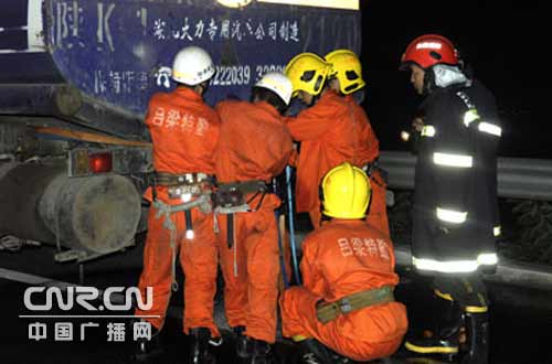 接到報(bào)警后,呂梁市消防支隊(duì)119指揮中心迅速調(diào)集6輛消防車(chē),27名指戰(zhàn)員火速趕赴現(xiàn)場(chǎng)。經(jīng)詢問(wèn)現(xiàn)場(chǎng)的知情人和對(duì)災(zāi)害現(xiàn)場(chǎng)的初步偵察,得知一輛車(chē)牌號(hào)為陜K1910裝有24噸汽油的油槽車(chē)從陜西榆林運(yùn)往山西呂梁市,在距離石高速口500米的下坡路段時(shí)與一輛大貨車(chē)發(fā)生追尾事故,車(chē)牌號(hào)為陜K1910油罐車(chē)卸油口被撞裂開(kāi)一條大口,大量汽油呈噴射狀向外漏,沿高速路流淌距離長(zhǎng)達(dá)1公里左右,此時(shí)只要有一點(diǎn)火星,就可能發(fā)生爆炸事故,高速路旁邊的居民區(qū)將夷為平地,情況萬(wàn)分危機(jī)。