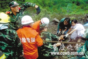 由于連日暴雨,昨天凌晨6時(shí)許,省道103渝巴路云陽(yáng)段突發(fā)大面積山體滑坡,泥石將途經(jīng)此地的一輛“雪佛蘭”轎車(chē)掩埋。接到報(bào)警后,云陽(yáng)和萬(wàn)州的消防緊急趕到現(xiàn)場(chǎng),經(jīng)5小時(shí)努力,成功救出3名受傷男子。目前,3人脫離生命危險(xiǎn)。