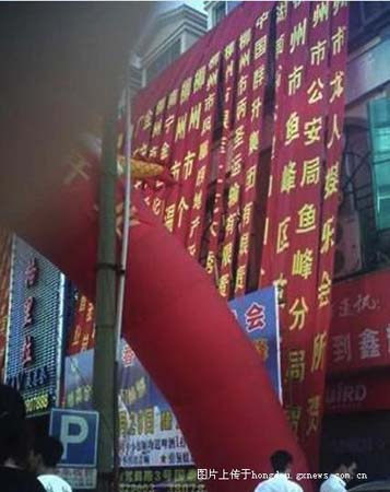 8月28日,位于柳州市文惠橋南頭的一家夜總會開業(yè)。三天后,網友“fox_nn:”在紅豆社區(qū)柳州論壇上發(fā)帖并配上圖片。圖片上夜總會開業(yè)的祝賀條幅,幾乎把整個樓房都蓋住了,其中最引注目的,是標注柳州市魚峰區(qū)政府及柳州市魚峰區(qū)公安分局祝賀的條幅。