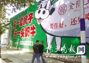 “買房送奶牛,還有這樣的事情。俊弊蛱煲淮笤,記者接到一個朋友的電話說,他在新街口看到一幅“金陵王榭”樓盤的戶外廣告,廣告詞寫著“買一套房子送一頭奶!。朋友感到很納悶,都是市中心的房子,奶牛送回家怎么養(yǎng)呀?根據(jù)朋友的介紹,記者來到了這塊頗為“醒目”的廣告招牌底下,只見廣告牌上買房子送奶牛的大字頗為醒目。