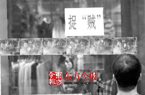 商丘市步行街一家服裝店因衣物被盜,店方從監(jiān)控錄像里截出6幅圖片,沖洗后貼在店鋪櫥窗外,引來(lái)很多市民駐足觀看。