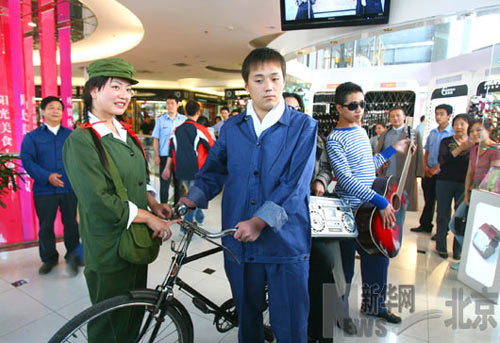 其中,一個(gè)代表上世紀(jì)70年代工人形象的男士身穿一身藍(lán)色工作服,推著一輛老式“永久牌”自行車,展示著當(dāng)年的“流行風(fēng)尚”;一個(gè)小伙子身穿;晟馈⒋髦蝮$R,手彈吉他,邊走邊唱,這是上世紀(jì)80年代時(shí)尚潮流青年的形象再現(xiàn)。