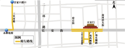 限行路段:長(zhǎng)安街府右街南口至南河沿南口雙向,人民大會(huì)堂西側(cè)路和天安門廣場(chǎng)東側(cè)路,禁止非機(jī)動(dòng)車和行人通行,公交車甩站通過(guò),地鐵天安門東站、西站甩站通過(guò)。