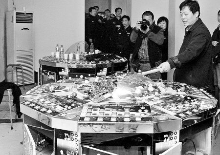 下午3時20分,記者隨民警來到經(jīng)二路一家沒有任何店名的門面房前。這個賭博窩點(diǎn)已聞訊關(guān)上了防盜門,記者注意到,門外還張貼著招聘服務(wù)員的啟事。民警強(qiáng)行將門打開,只見50多平方米的屋內(nèi)已空無一人,里面擺著30多臺“動物樂園”等3種賭博機(jī)。門口一中年婦女告訴記者,這家賭博廳開業(yè)已有一個月了,“他們害人害己,早該取締了!