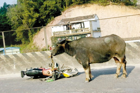 前天上午,惠州市區(qū)一頭水牛受驚嚇頂翻摩托,連接撞翻兩人,然后霸占路面,無人敢接近,導(dǎo)致交通堵塞。惠州民警擔(dān)心水牛傷人,連續(xù)開十槍才將這頭猛牛擊斃。
