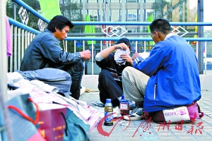 來(lái)自黑龍江的老頭其實(shí)不到50歲,雙手有殘疾。他和來(lái)自甘肅的小軍已經(jīng)“搭檔”了一年多,關(guān)系最好。聽(tīng)老頭說(shuō),還在北京時(shí),小軍當(dāng)保安,他燒鍋爐,兩人就冒充過(guò)便衣警察和嫖客,到酒吧里抓小姐,“弄”到了好幾個(gè)包。后來(lái)活做膩了,兩人開(kāi)始流浪,結(jié)伴南下。從北京到廣州,一路風(fēng)餐露宿,足足走了半年才到。最后選定了人民北天橋這個(gè)據(jù)點(diǎn)。