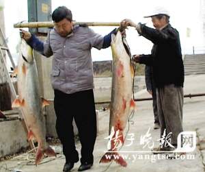 昨天上午,老胡請(qǐng)來(lái)漁民用魚(yú)網(wǎng)對(duì)5年來(lái)從未捕撈的魚(yú)塘進(jìn)行捕撈。魚(yú)網(wǎng)撒下去不到兩分鐘,就從水面上傳來(lái)嘩啦啦的水浪。岸上人一看,只見(jiàn)水中的魚(yú)網(wǎng)被水下白色物體咬住了,大家一起拉網(wǎng),網(wǎng)下掀起層層的水花,兩條漁船迅速合并,幾名漁民聯(lián)手協(xié)力,用了半個(gè)小時(shí),才將魚(yú)網(wǎng)拽住。這時(shí),兩條一米多長(zhǎng)的大魚(yú)一番折騰后耗盡了力氣,全身纏著魚(yú)網(wǎng),露出了發(fā)白的肚皮。