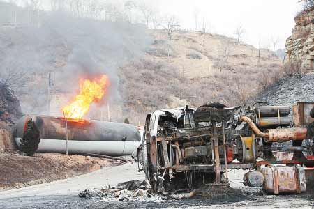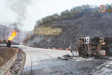 在現(xiàn)場(chǎng)記者看到,這輛油罐車車體已經(jīng)分離,傾倒在公路一邊的油罐仍在燃燒,濃煙有10米多高.兩邊山上被閃爆引燃的山火已經(jīng)被控制.公路右側(cè)山上一戶村民家存放的2萬多公斤玉米全部被引燃.