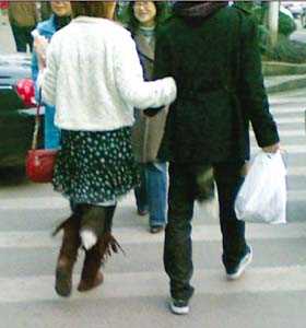 一對(duì)年輕的情侶手挽手走在大街上,兩人衣服背后竟各有一條狐貍尾巴。1月19日,有網(wǎng)友在網(wǎng)上發(fā)帖稱,自己在楊家坪直港大道遇到了身著“狐尾裝”的一對(duì)男女,并附有手機(jī)拍攝的照片。該帖發(fā)出后,引來網(wǎng)友熱議,許多80后的網(wǎng)友直呼“妖孽”,并大嘆跟不上這種怪異潮流。
