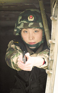 10米外,一個(gè)身著特警作戰(zhàn)服的女兵掏槍、舉槍?zhuān)鞍取钡囊宦,彈殼無(wú)影。