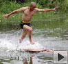 (獨竹漂隊長)最開始的困難就是怎樣爬上這個桿子,我們用了一個月的時間我們才穩(wěn)定的站在桿子上面。首先就覺得很自豪吧,站在一根竹子上,別人岸上的人都看著,看著自己,都覺得,這人不簡單。