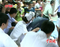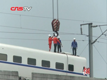 【解說】據(jù)了解,事故發(fā)生在溫州雙嶼下岙路口,記者目測有三節(jié)車廂掉落高架下,另外一節(jié)車廂與地面呈90度,連著在50多米高的地面與高架橋之間。事故發(fā)生后,鐵道部緊急向各鐵路局下發(fā)了調(diào)度命令,通報溫州動車事故有關(guān)情況。