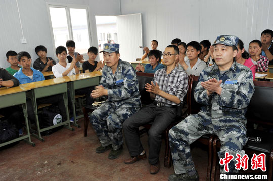 5月14日,在四川蘆山地震震中龍門(mén)鄉(xiāng)的晨陽(yáng)希望學(xué)校九年級(jí)二班的板房教室里,舉辦了一次特殊的班會(huì)。安源 攝