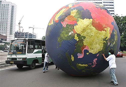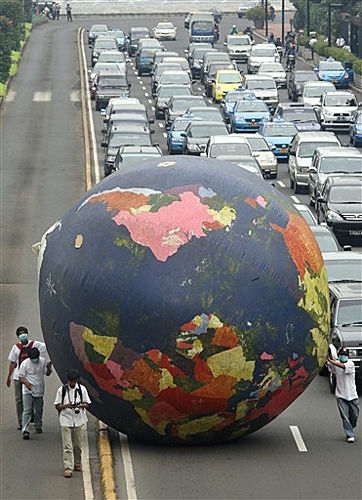 11月16日,印尼的環(huán)保主義者在首都雅加達(dá)推動(dòng)一個(gè)巨大的充氣地球模型,參加此次“清潔空氣,控制溫度”活動(dòng)。印尼是全球重要的溫室氣體排放國。今年12月印尼巴厘島將迎來聯(lián)合國氣候變化大會(huì)。