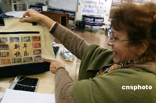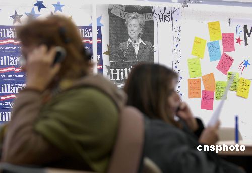 二零零七年的最后一個(gè)周末,美國(guó),設(shè)于舊廠房中的希拉里舊金山競(jìng)選總部的義工們加班加點(diǎn),給愛(ài)荷華州的選民打電話,號(hào)召民主黨的選民們?yōu)橄@锿镀。中新社發(fā) 陳鋼 攝