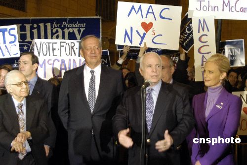 美國(guó)共和黨總統(tǒng)參選人、亞利桑那州的聯(lián)邦參議員麥凱恩(右三)四日在紐約中央火車(chē)站與支持者和記者見(jiàn)面,為五日美國(guó)二十余州進(jìn)行的二00八年大選初選作最后沖刺。希拉里的支持者也來(lái)到現(xiàn)場(chǎng),進(jìn)行“選前對(duì)抗”。中新社發(fā) 李靜 攝