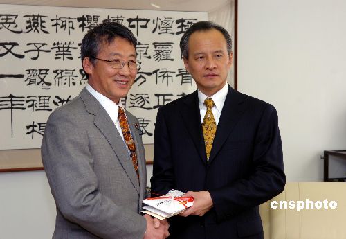 2月7日,日本執(zhí)政黨之一的自民黨國際局長三原朝彥(左)來到中國駐日使館,代表該黨向中國雨雪災區(qū)捐款。中國駐日大使崔天凱作為中國政府代表接受此項捐款。中新社發(fā) 滕劍峰 攝