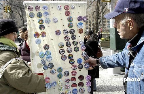 3月22日,紐約街頭一名反戰(zhàn)女士(左)自制各種反戰(zhàn)及總統(tǒng)大選的徽章在街頭售賣,吸引不少路人選購(gòu)。她稱很多美國(guó)民眾和她一樣已經(jīng)厭倦了布什政府發(fā)動(dòng)的這場(chǎng)勞命傷財(cái)?shù)膽?zhàn)爭(zhēng)。 中新社發(fā) 鄧悅 攝