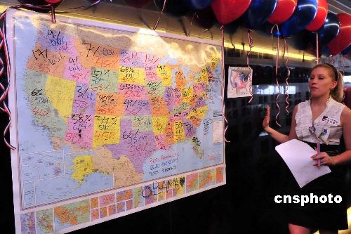 十一月五日,在香港的美國商會舉辦活動,讓居港的美國人士等候大選結果,現(xiàn)場亦公布麥凱恩及奧巴馬在各州得票的情況。中新社發(fā) 譚達明 攝