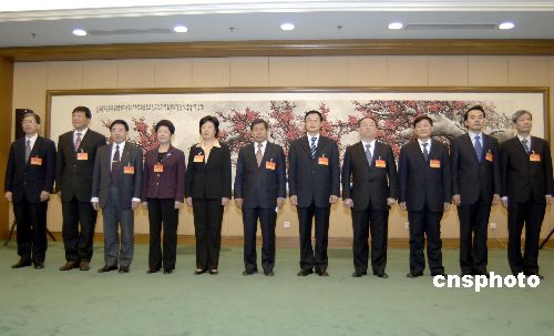 政協(xié)北京市第十一屆委員會一月二十三日下午舉行會議,選舉產(chǎn)生新一屆委員會領(lǐng)導(dǎo)班子,陽安江獲選連任北京市政協(xié)主席。本次會議選舉產(chǎn)生了十名政協(xié)副主席、一名政協(xié)秘書長、一百三十一名常務(wù)委員。馬大龍、王永慶、沈?qū)毑、陳平、趙文芝(女)、唐曉青(女)、葛劍平、傅惠民、蔡國雄、熊大新等任政協(xié)副主席。圖為新一屆領(lǐng)導(dǎo)班子與媒體見面。中新社發(fā) 徐曦弋 攝