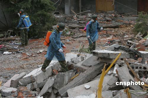 5月20日,地震的重災區(qū)四川省什邡市紅白鎮(zhèn),防疫工作正在進行。