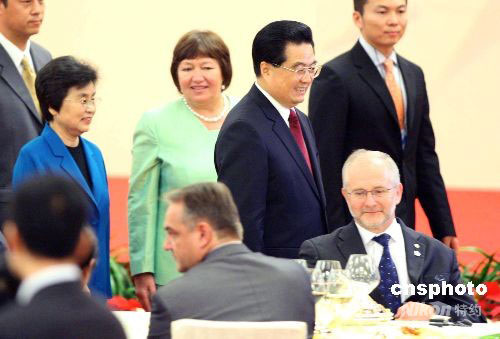 圖為胡錦濤夫婦與國際殘奧委會主席克雷文夫婦進(jìn)入宴會現(xiàn)場。