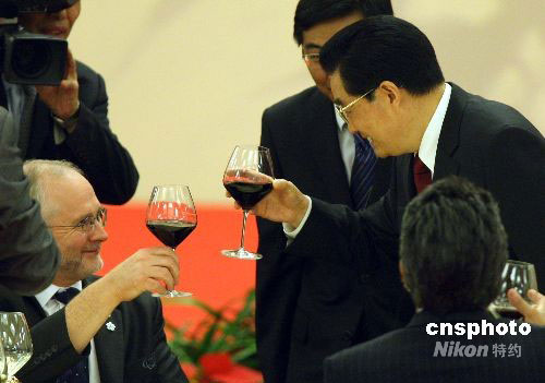 圖為胡錦濤在歡迎宴會上向國際殘奧委會主席克雷文祝酒致意。