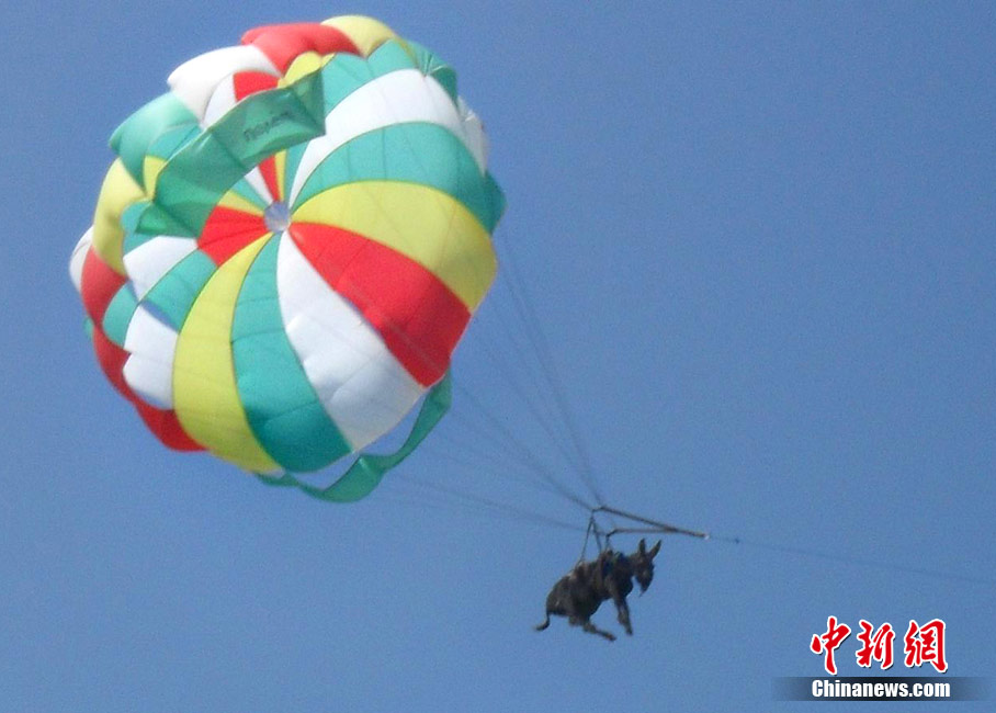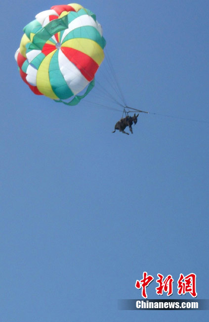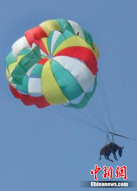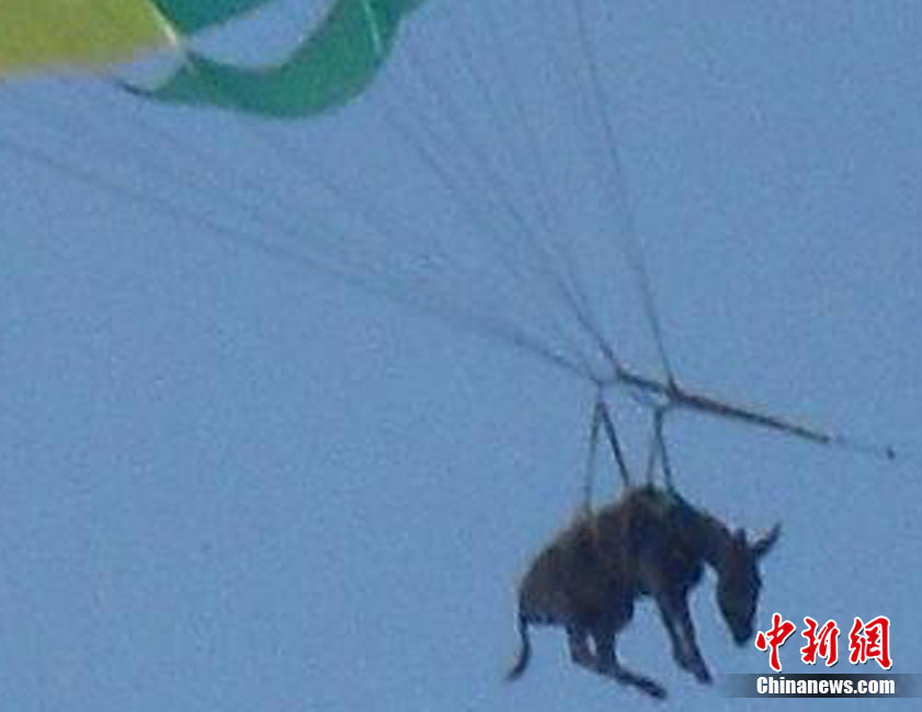 俄羅斯警方于20日表示,上周在俄羅斯東部亞速海岸,游客及當(dāng)?shù)孛癖姀恼克{(lán)的天空中看到了驚人的一幕:一頭身上綁著降落傘的毛驢正在天上繞著圈圈。 據(jù)稱(chēng),當(dāng)時(shí)這頭毛驢因?yàn)轶@恐,而破嗓大叫。