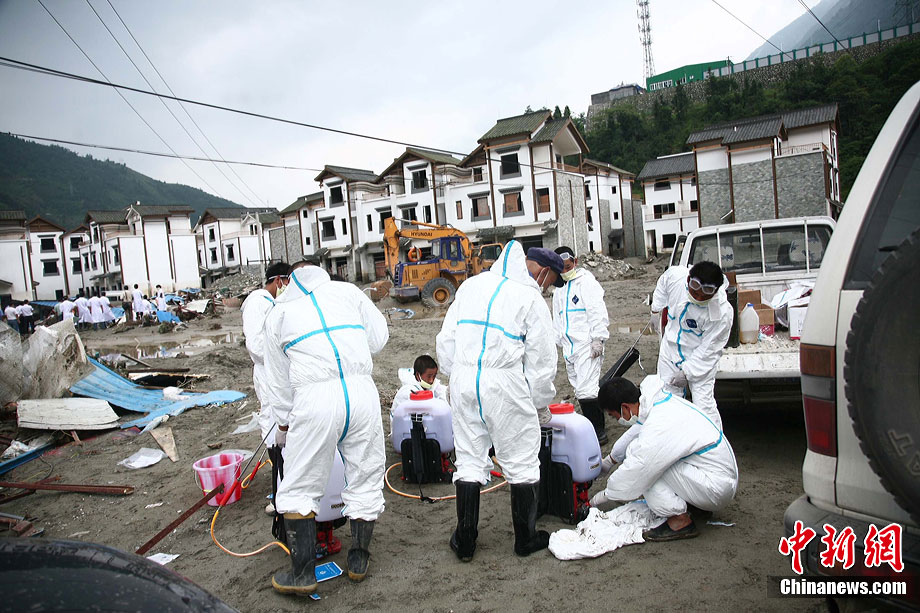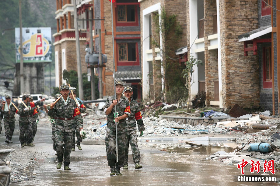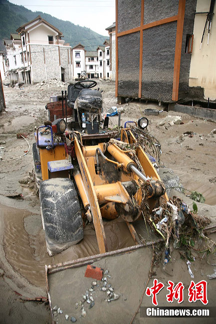 8月18日,經(jīng)過搶險(xiǎn)隊(duì)連夜奮戰(zhàn),汶川泥石流重災(zāi)區(qū)映秀鎮(zhèn)新城水位終于退去,防疫人員、清淤隊(duì)伍陸續(xù)進(jìn)入新城展開清潔工作,武警水電三總隊(duì)于當(dāng)日對(duì)堰塞體進(jìn)行第三次爆破。圖為退水后的映秀鎮(zhèn)新城。中新社發(fā) 張浪 攝