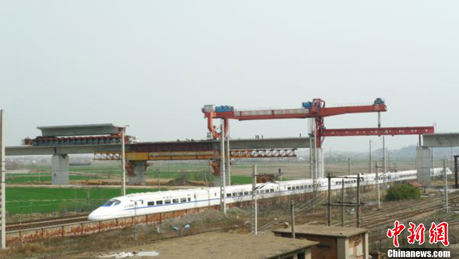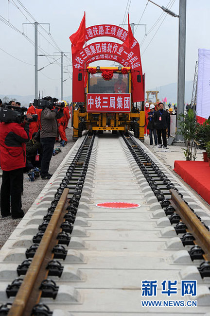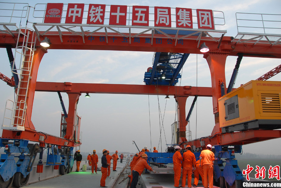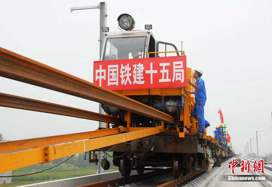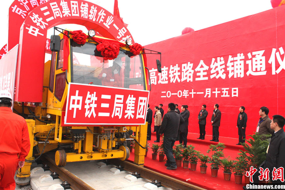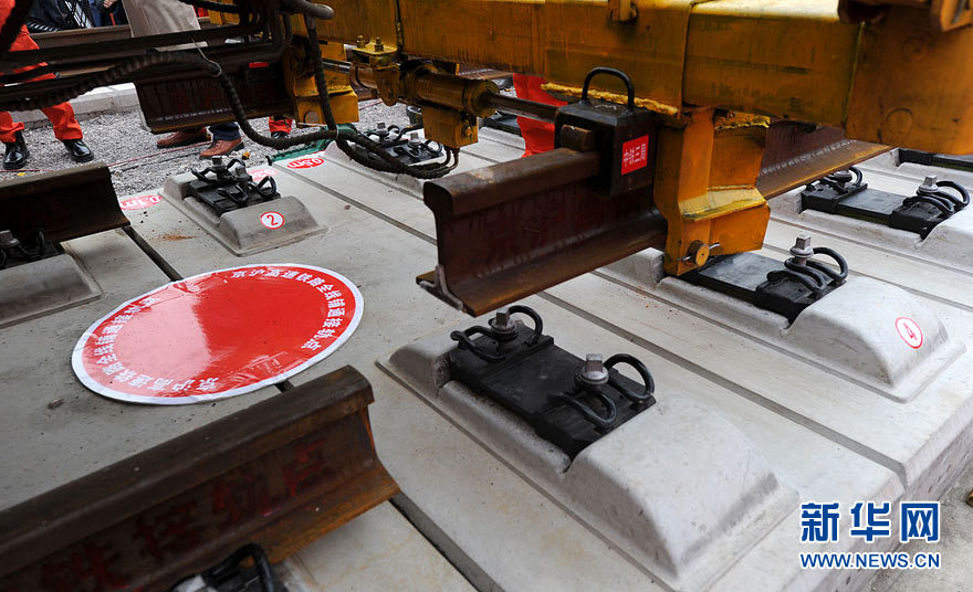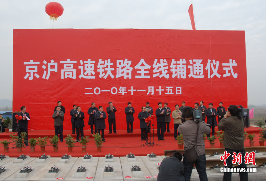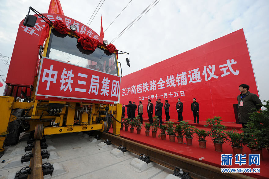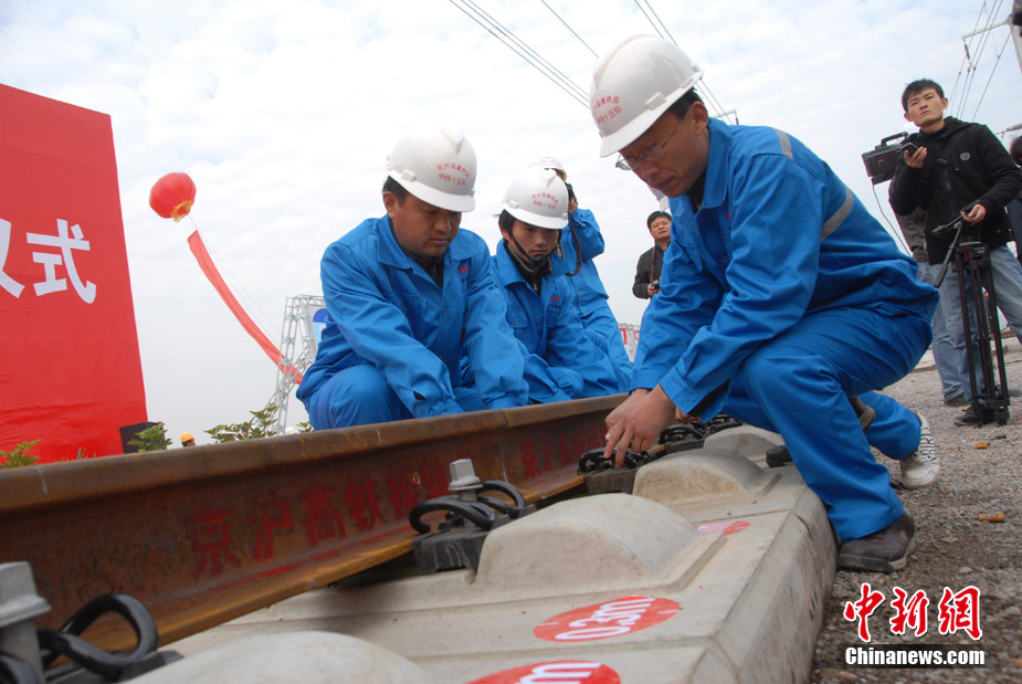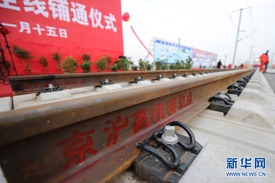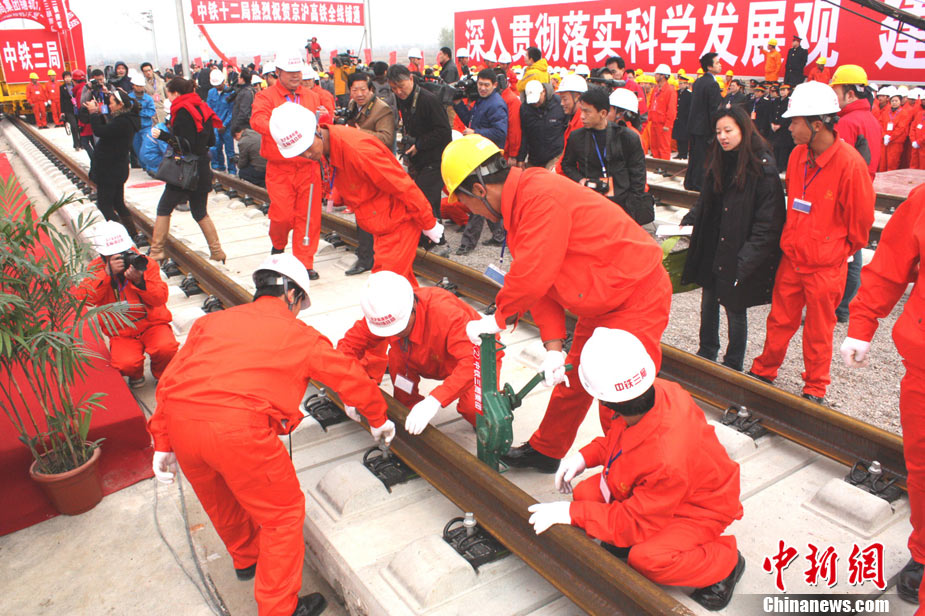 11月15日上午,隨著最后一根鐵軌在安徽蚌埠段順利鋪下,京滬高速鐵路全線完成鋪通工程,這是京滬高速鐵路建設(shè)取得的又一重大階段性成果。京滬高速鐵路的全線鋪通,標(biāo)志著以線下工程和鋪軌為主的站前工程全部結(jié)束,下一步將全力推進(jìn)以牽引供電、通信、信號、電力“四電集成”施工和站房建設(shè)為主的站后工程施工,展開全線聯(lián)調(diào)聯(lián)試。圖為15日,京滬高鐵先導(dǎo)段鋪通儀式在京滬高鐵蚌埠南火車站舉行。中鐵十五局員工在接軌點安裝最后一組鋼軌鎖定螺栓。(張智海 范剛軍 李紅)