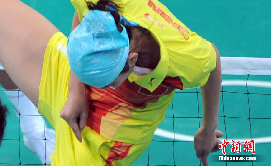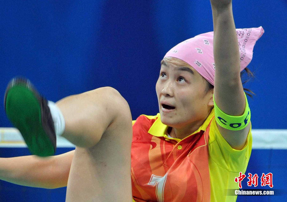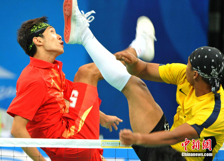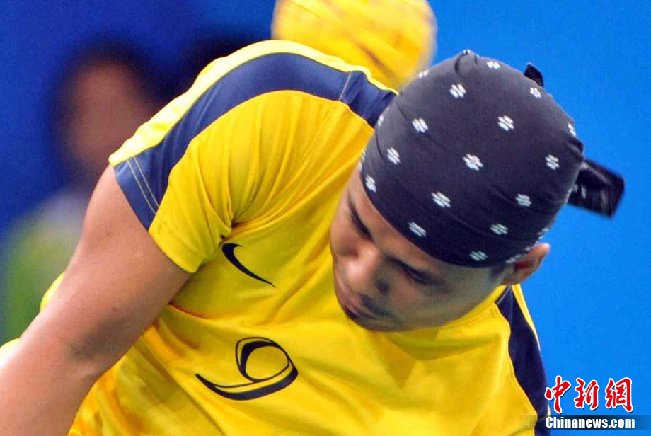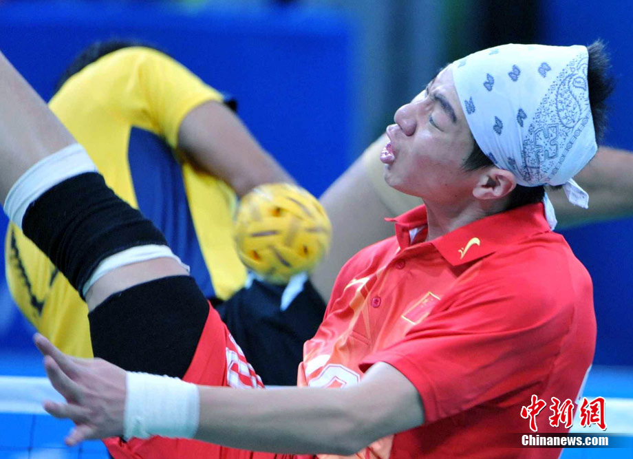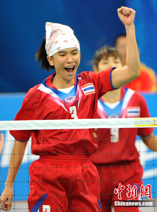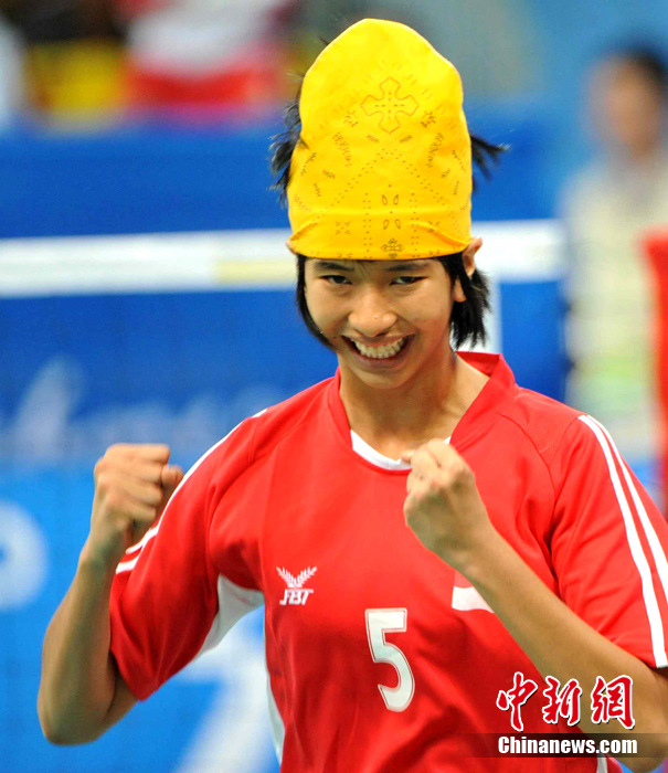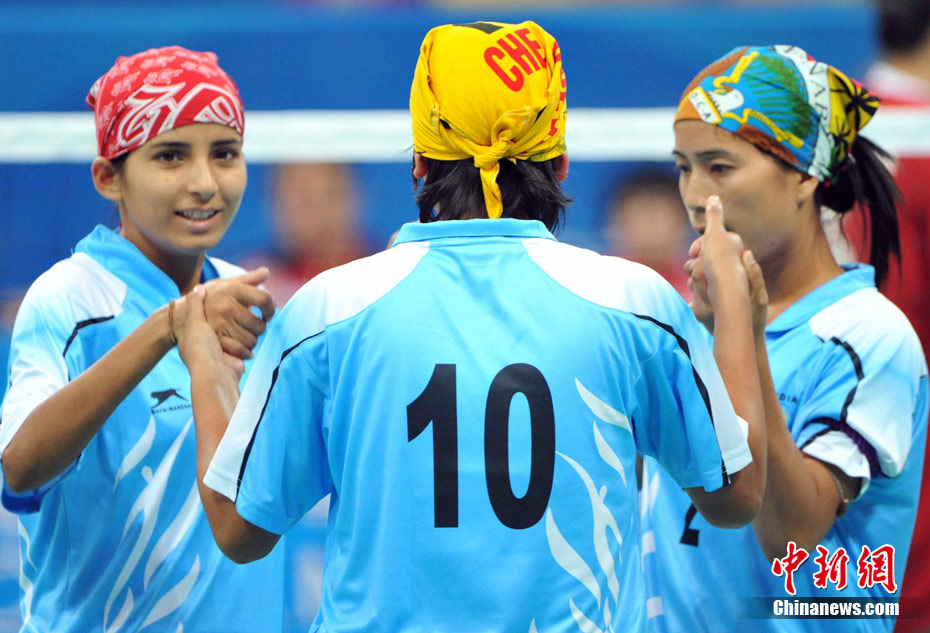亞運藤球賽場上,不少選手喜歡戴頭巾,色彩斑斕的頭巾把運動場變成了一個“T臺秀場”。中新社記者 柯小軍 攝