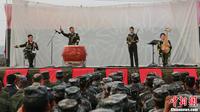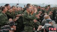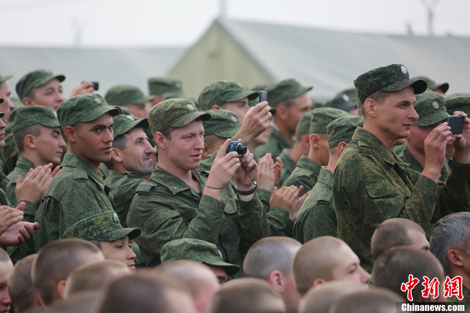 8月10日,隨同中方參演部隊(duì)赴俄羅斯參加“和平使命-2013”中俄聯(lián)演的沈陽軍區(qū)政治部文工團(tuán)演員們,為中俄千余名參演官兵獻(xiàn)上了一場精彩的文藝晚會。豐富多彩的文藝節(jié)目,將位于切巴爾庫爾訓(xùn)練場的中俄聯(lián)演野營村,變成了友誼的盛會、歡樂的海洋。 圖為精彩節(jié)目吸引俄國官兵。中新社發(fā) 李祥輝 攝