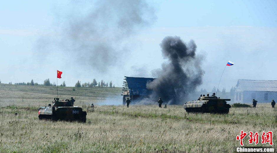 8月12日12時(北京時間下午2時),“和平使命-2013”中俄聯(lián)合反恐軍事演習(xí),在俄羅斯切巴爾庫爾合同訓(xùn)練場進(jìn)行了實(shí)兵實(shí)彈協(xié)同訓(xùn)練。圖為中俄雙方參演官兵共同向前推進(jìn)清剿殘敵。中新社發(fā) 譚長俊 攝