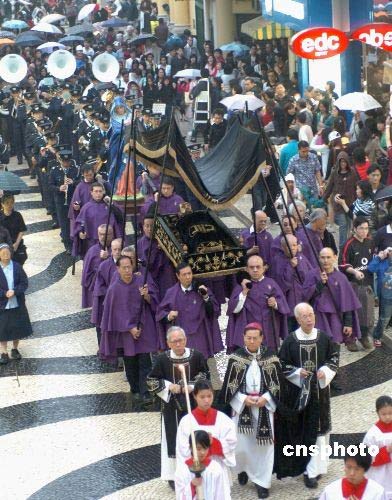 三月二十一日復活節(jié)前夜,澳門千余名教徒抬著天主教耶穌圣尸穿大街過小巷,走“拜苦路”。中新社發(fā) 史利 攝