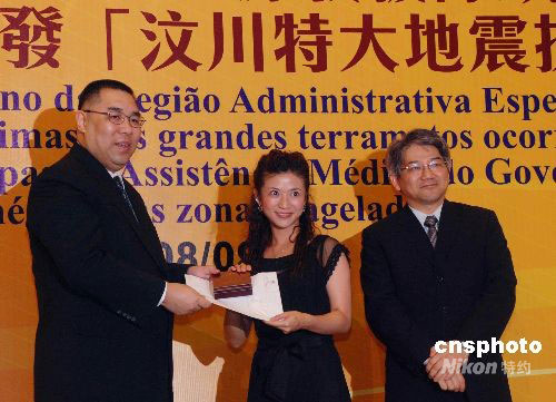 澳門(mén)特區(qū)政府社會(huì)文化司司長(zhǎng)崔世安(左)及衛(wèi)生局局長(zhǎng)李展?jié)?右)九月三日晚向澳門(mén)援助四川地震災(zāi)區(qū)的三批五十六名醫(yī)護(hù)人員逐一頒發(fā)獎(jiǎng)狀及四川省政府贈(zèng)送的“抗震救災(zāi)紀(jì)念章”,以表彰他們的貢獻(xiàn)。中新社發(fā) 畢永光 攝