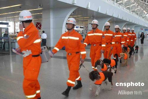 5月13日,沈陽市消防支隊30名特勤官兵帶著10條消防搜救犬,乘專機火速奔赴四川地震災區(qū),全力參加抗震救災。 圖為出發(fā)前的特勤官兵和搜救犬。中新社發(fā) 王忠喜 攝