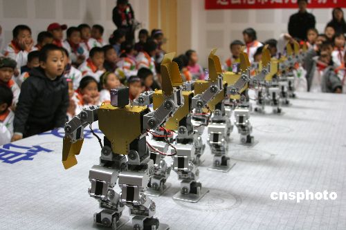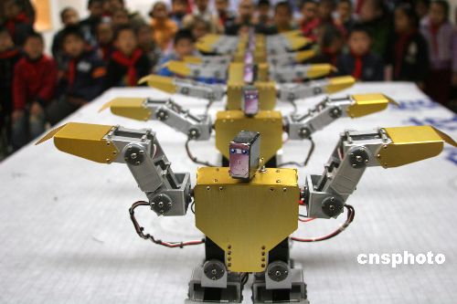 11月15日,人形機(jī)器人正在表演《千手觀音》節(jié)目。當(dāng)天,人形機(jī)器人表演科技觀摩活動在江蘇連云港婦女兒童活動中心舉行,15個人形機(jī)器人表演了《千手觀音》、小品《賣拐》、體操等節(jié)目。由中科大花費(fèi)兩年時間研制成功的人形機(jī)器人,身體具有17個自由度的調(diào)節(jié)功能,可做俯臥站立、跳舞、擁抱、做操等二十多個動作,代表了中國表演類機(jī)器人的最高水平。中新社發(fā) 穆道勇 攝