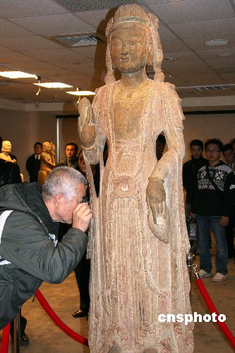 一月四日,一位觀眾在臺灣中華皇家藝術(shù)博物館近距離欣賞首次展出的該館鎮(zhèn)館之寶——國寶級文物“大勢至菩薩”石像。由該館推出的“中華瑰寶系列——宋朝漢白玉十八羅漢特展”當(dāng)日在臺北開展,造型中西合壁、保存完好,被認(rèn)為是全球唯一保存最完整的“大勢至菩薩”塑像也同期與觀眾首度見面。據(jù)考證,這尊高一百九十八厘米、石灰石貼金敷彩“大勢至菩薩”為東魏至北齊年間作品,距今約一千六百年至一千四百年。中新社發(fā) 孫自法 攝