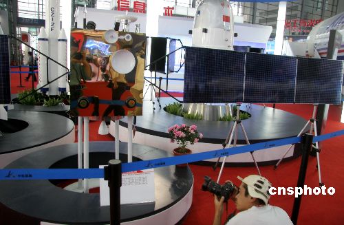 10月11日,“嫦娥一號(hào)”衛(wèi)星模型在深圳高交會(huì)上亮相,因其是中國(guó)第一顆人造月球衛(wèi)星并即將發(fā)射而備受關(guān)注。第九屆深圳高交會(huì)將于當(dāng)晚開幕。中新社發(fā) 孫自法 攝
