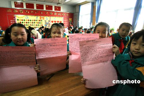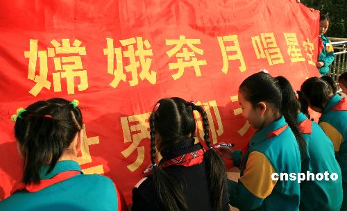 11月5日,“嫦娥一號(hào)”衛(wèi)星成功減速,進(jìn)入月球軌道。山東師大附小為此舉辦了“嫦娥一號(hào)”主題慶祝儀式,師生們?cè)谧YR“嫦娥一號(hào)”成功奔月的橫幅上簽字。孩子們還向研制“嫦娥一號(hào)”的科學(xué)家們寫了熱情洋溢的祝賀信,表達(dá)對(duì)他們的祝賀和自己要好好學(xué)習(xí)、建設(shè)祖國的決心。中新社發(fā) 周青先 攝