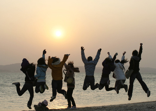 臺(tái)灣地區(qū)2007年最后一道夕陽,十二月三十一日出現(xiàn)在金門,古寧頭慈堤外,青年追日族興奮揮別落霞,準(zhǔn)備迎接新一年到來。(“中央社”圖;倪國(guó)炎攝)