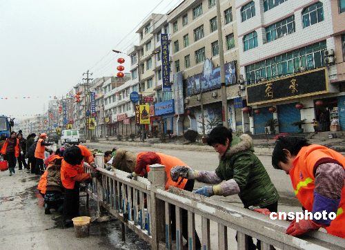 春節(jié)期間,貴州福泉市組織2000余名干部職工、武警官兵在市區(qū)街頭巷尾和205省道(馬遵公路福泉段)上清理凝凍冰雪過(guò)新年。 中新社發(fā) 易勝武 攝