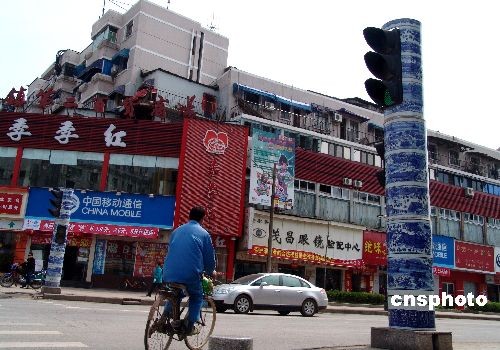 3月20日,“清明上河圖”瓷器紅綠燈亮相景德鎮(zhèn)市街頭。該燈為白底青花圖案,畫面內容是清明上河圖,直徑0.5米,高4.2米。樹立在在景德鎮(zhèn)新廠的瓷器紅綠燈不但能指揮交通,美化城市,同時正逐漸成為景德鎮(zhèn)鮮明的瓷文化標志符號之一。中新社發(fā) 石衛(wèi)明 攝