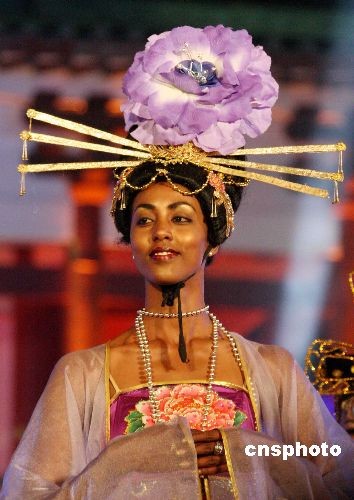 4月1日晚,2008國際旅游小姐總決賽“迪斯科皇后”單項(xiàng)決賽晚會在河南洛陽舉行。來自世界115個(gè)國家的115位佳麗參賽,在晚會現(xiàn)場4位不同膚色的佳麗當(dāng)場“秀”起了中國傳統(tǒng)服飾--唐裝。中新社發(fā) 曾憲平 攝