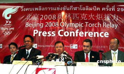 4月17日,泰國(guó)奧委會(huì)在國(guó)家體育館就奧運(yùn)火炬?zhèn)鬟f活動(dòng)舉行新聞發(fā)布會(huì)。泰國(guó)奧委會(huì)主席育塔薩先生(中)表示,曼谷為迎接北京奧運(yùn)會(huì)圣火已經(jīng)做好一切準(zhǔn)備。曼谷的火炬?zhèn)鬟f活動(dòng)將在當(dāng)?shù)貢r(shí)間19日下午三點(diǎn)開始;鹁鎸穆忍迫私——耀華叻路起跑,途經(jīng)富有泰國(guó)民族文化特色的地點(diǎn),如大王宮、王家田廣場(chǎng)、民主紀(jì)念碑、五世王紀(jì)念廣場(chǎng)等,全程約10公里。 作者: 顧時(shí)宏