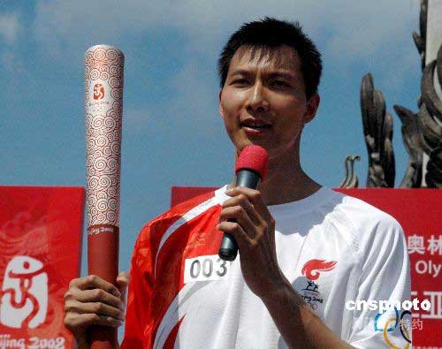 在NBA效力的中國球員易建聯(lián)四日跑第三棒,他祝愿北京奧運(yùn)會(huì)取得圓滿成功。中新社發(fā) 王辛莉 攝